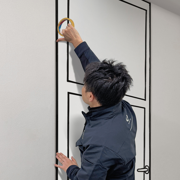 特殊ポリマー粘着層を備えた透明被膜を、ドア枠に圧着するだけで取付が完了する超低コスト施工。