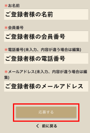 応募フォームでは、アプリで登録された方のお名前と会員番号は既に表示されておりますので、イベントに参加される方の、携帯電話番号とメールアドレスを必ずご入力の上、画面下部の「応募する」をタップし参加申し込みをお願いいたします。