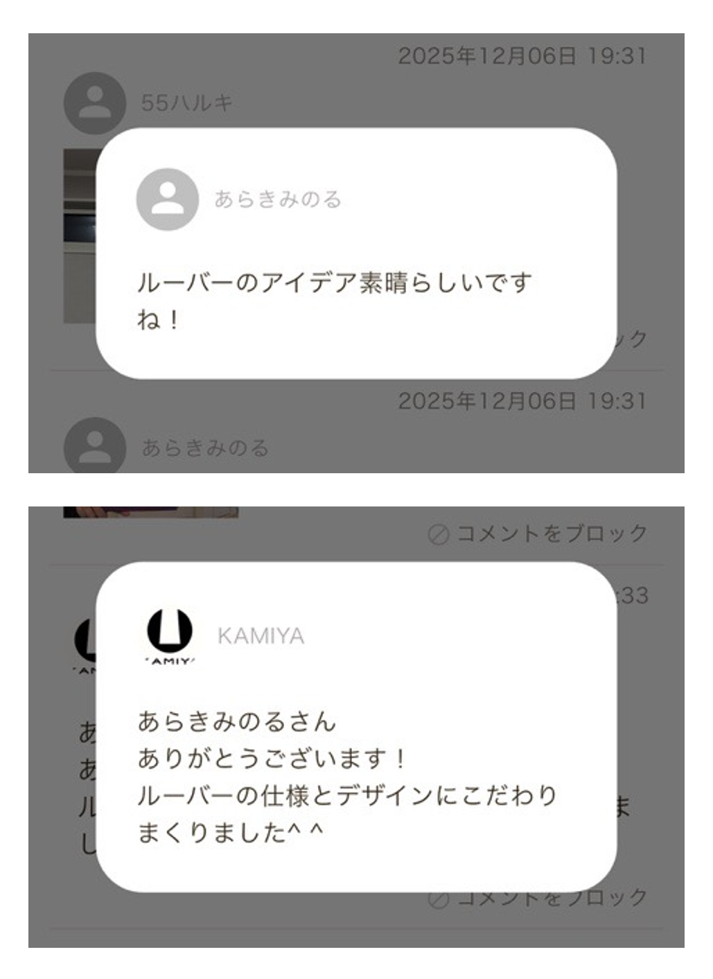 ニックネームしんたん様とKAMIYAスタッフのチャットコメントのやり取りをご紹介します。