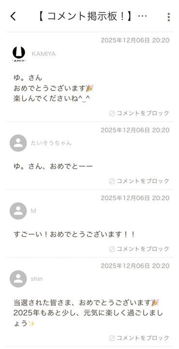 惜しくも当選しなかった方も、目玉商品の「Switch2」を見事射止めたニックネーム「ゆ。」様へ、次々と温かい祝福の言葉を贈ってくださいました。