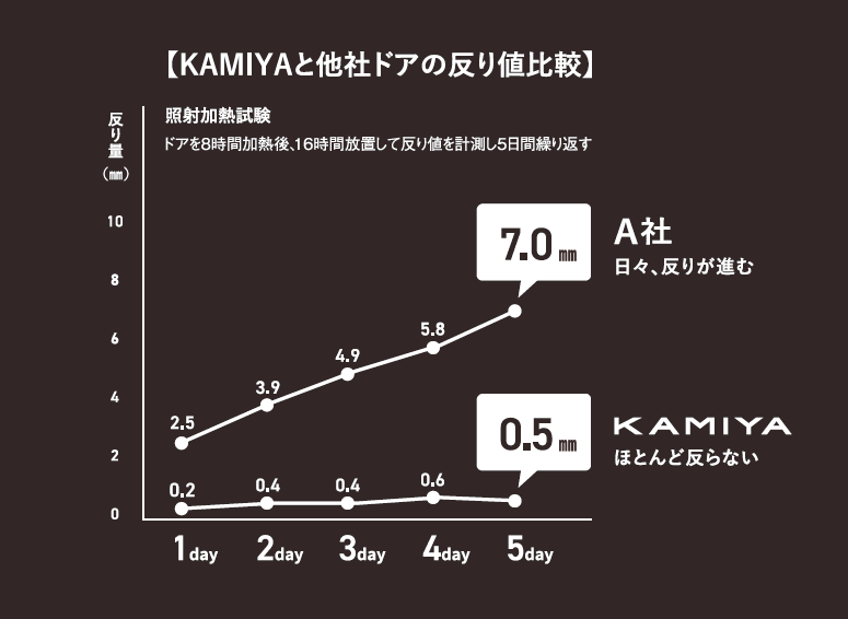 他社のドアは7.0mmと、開閉に支障が出るほど反っていますが、フルハイトドア®は0.5mmと、ほとんど反っていません。このデータが示す通り、他社製品よりも圧倒的に反りに強いドアであることが証明されています。
