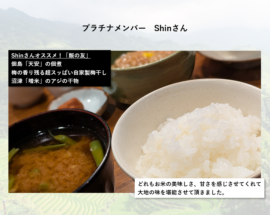 ご帰宅後も、収穫したての「フルハイト米」を食卓で囲み、「ご飯のお友はコレ!」という嬉しいご報告をいただきました。