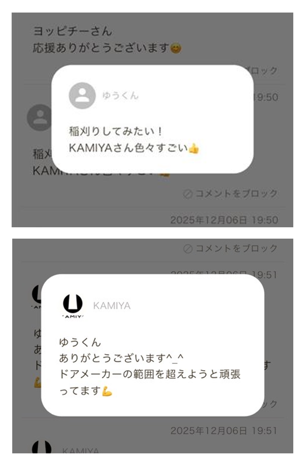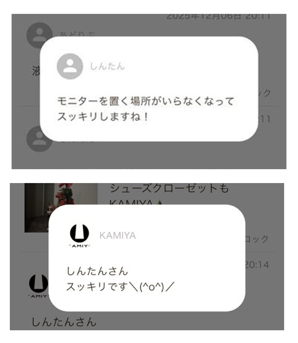 ニックネームしんたん様とKAMIYAスタッフのチャットコメントのやり取りをご紹介します。