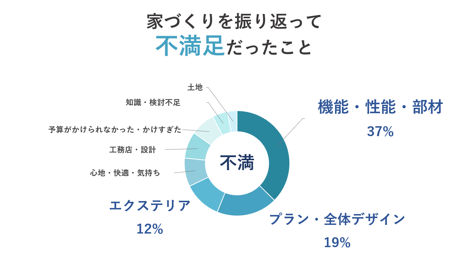 まず満足のグラフを見てみますと、最も多いのは「プラン・全体デザイン」、次が「機能・性能・部材」、そして「心地・快適さ・気持ち」と続きます。一方、不満足のグラフでは、「機能・性能・部材」に関する不満が最も多く、次いで「プラン・全体デザイン」、「エクステリア」となっています。この中から皆さんの満足・不満足の声をピックアップしご紹介します。