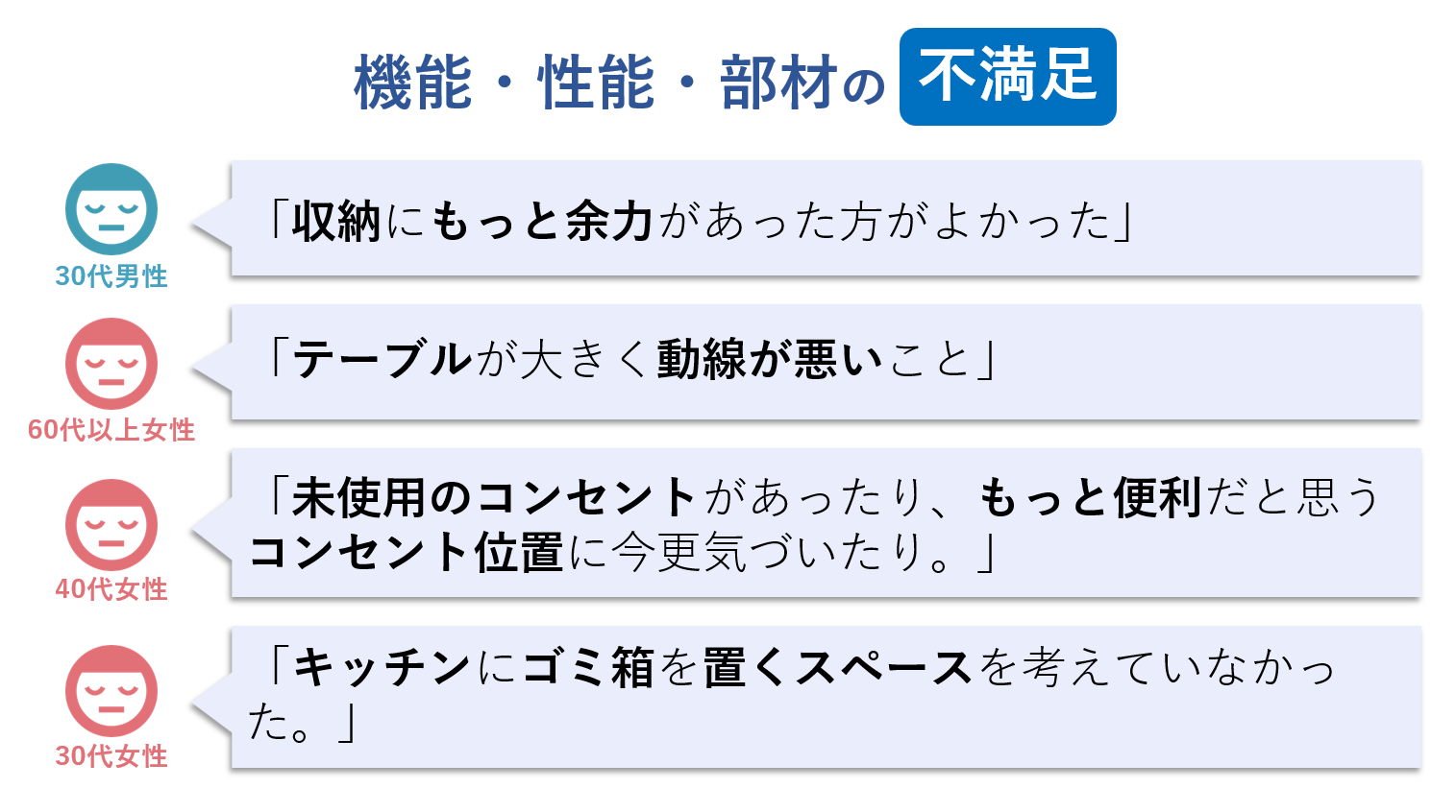 機能・性能・部材に不満を感じられた人は64人いらっしゃったのですが、そのうち12人はコンセントへの不満を感じられていました。また、キッチンのゴミ箱スペースは、うっかりしがちな点です。もともとキッチンスペースはなかなか広く取れないと思いますので、どれくらいのサイズのゴミ箱をどこに置くか、プラン段階で決めておかないと、入居後になってどこにも置き場所がないという事になりかねないですね。