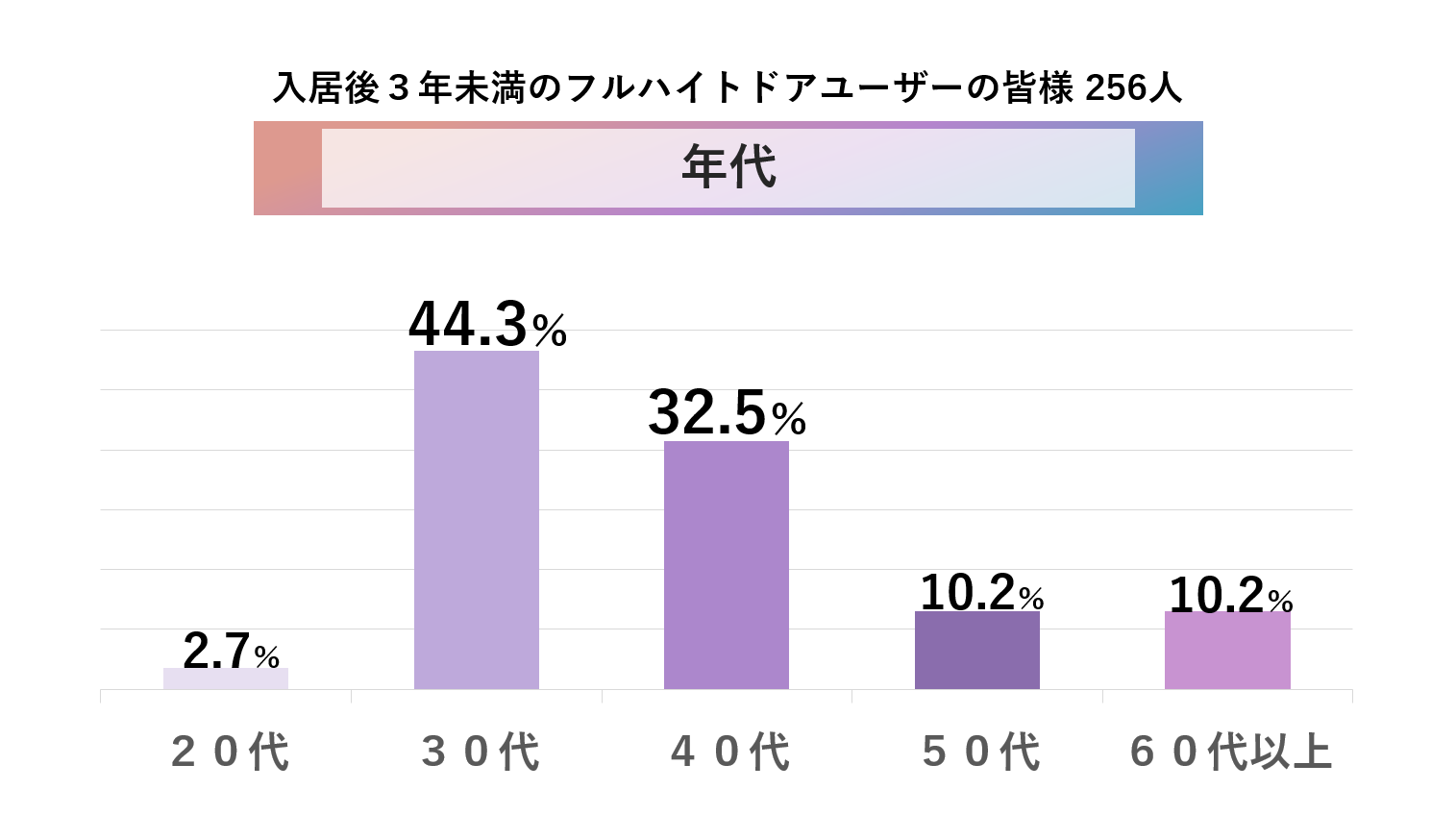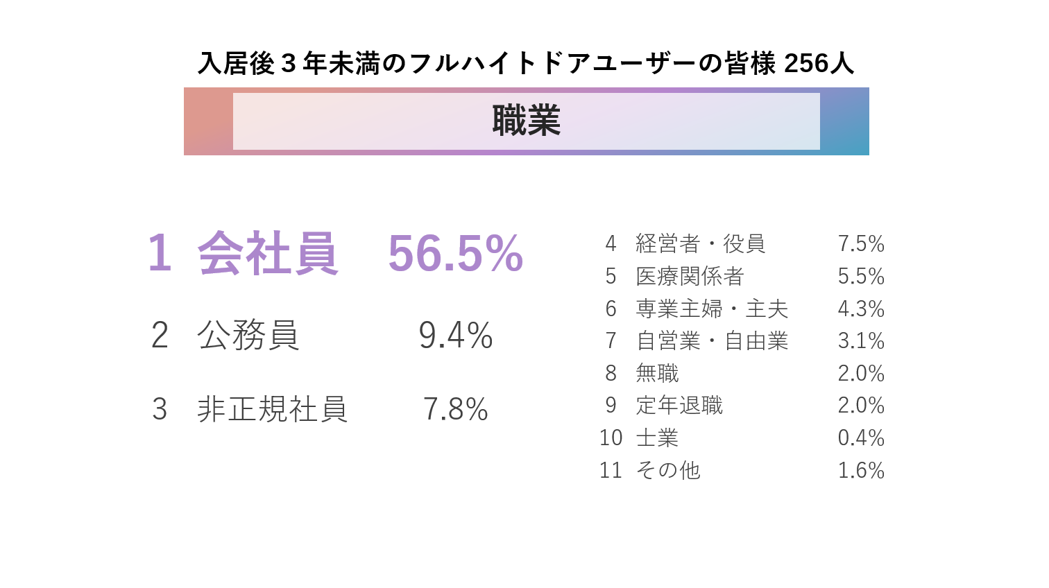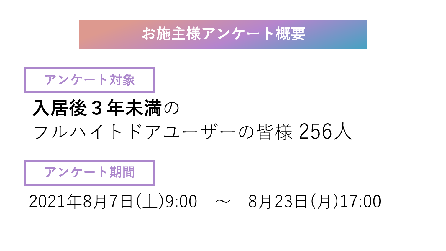 私たちは、フルハイトドア®を実際にご自宅へ導入されたお客様のうち入居後3年未満の方256名を対象に、フルハイトドア®の事だけでなく、家づくり全般に関するアンケート調査を2021年に実施しました。ちなみに、「入居後3年未満」という条件にした理由は、家づくりへの思いやこだわりなどの記憶がまだ鮮明に残っている時期であるため、リアルで率直な生の声をいただけるからです。
