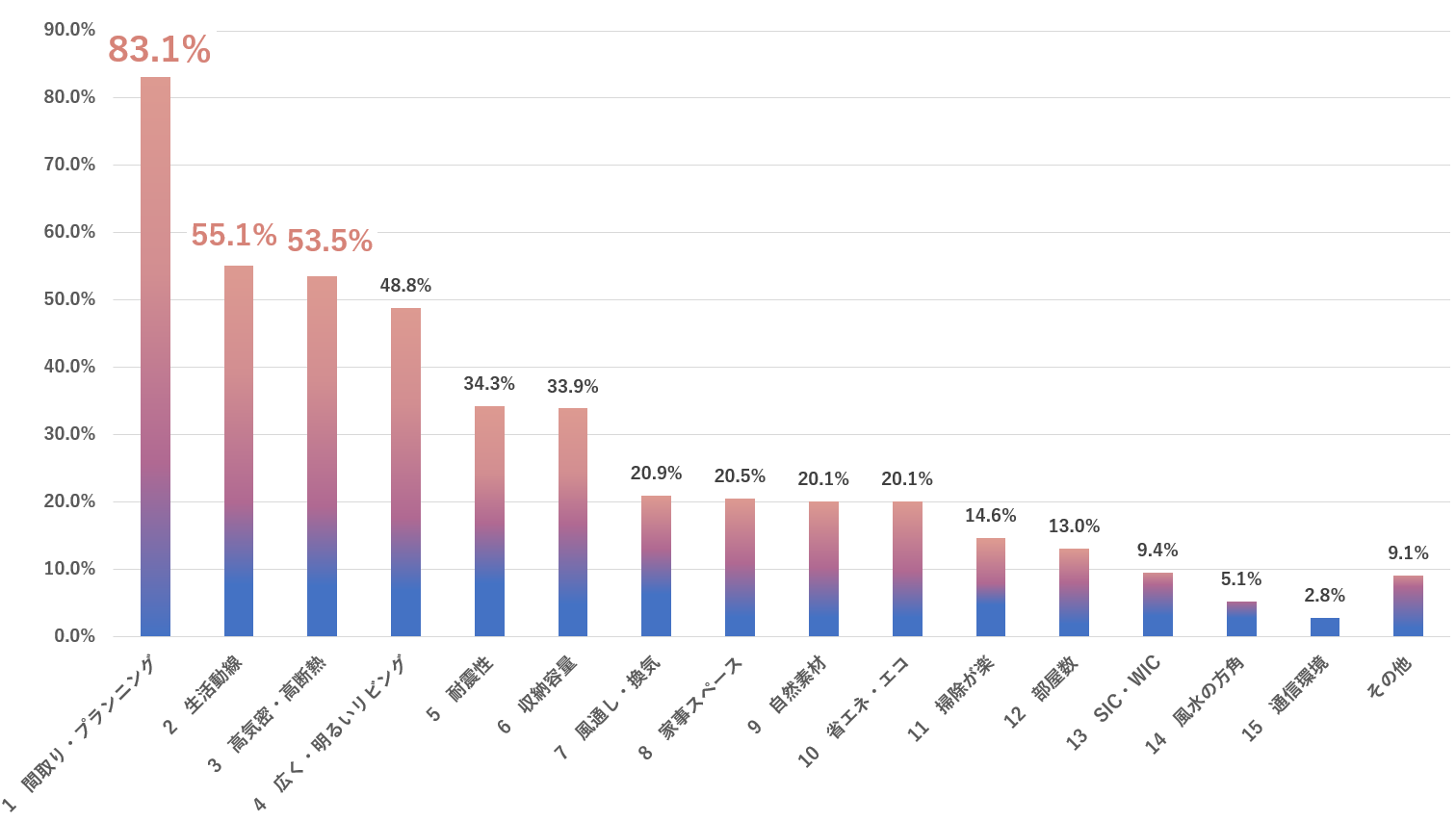 2位の生活動線と比べても、飛び抜けて多い結果となりました。間取りやプランの検討は大変ですが、一番楽しく夢が広がる時間でもあり、最も重要なポイントのひとつなので、納得の結果ですね^^