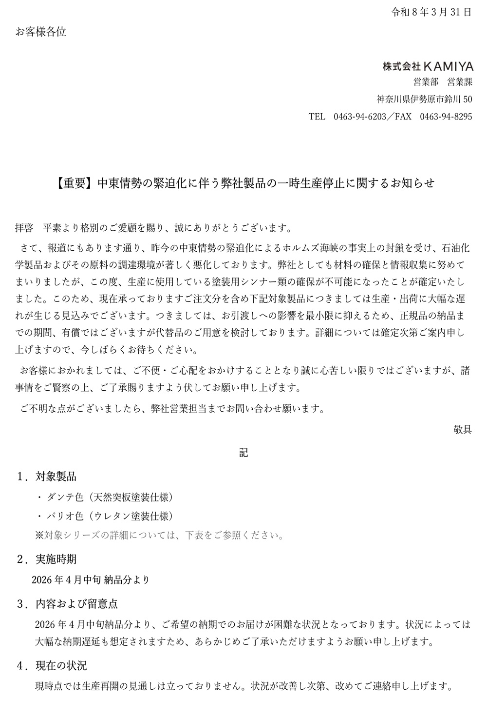 PDFのダウンロードはこちらから↓↓↓ 中東情勢による納期遅延について