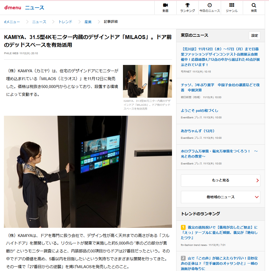dmenuニュース KAMIYA、31.5型4Kモニター内蔵のデザインドア「MILAOS」。ドア前のデッドスペースを有効活用
