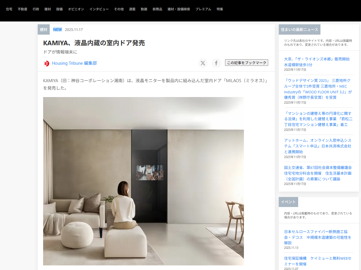 Housing Tribune Online KAMIYA、液晶内蔵の室内ドア発売
