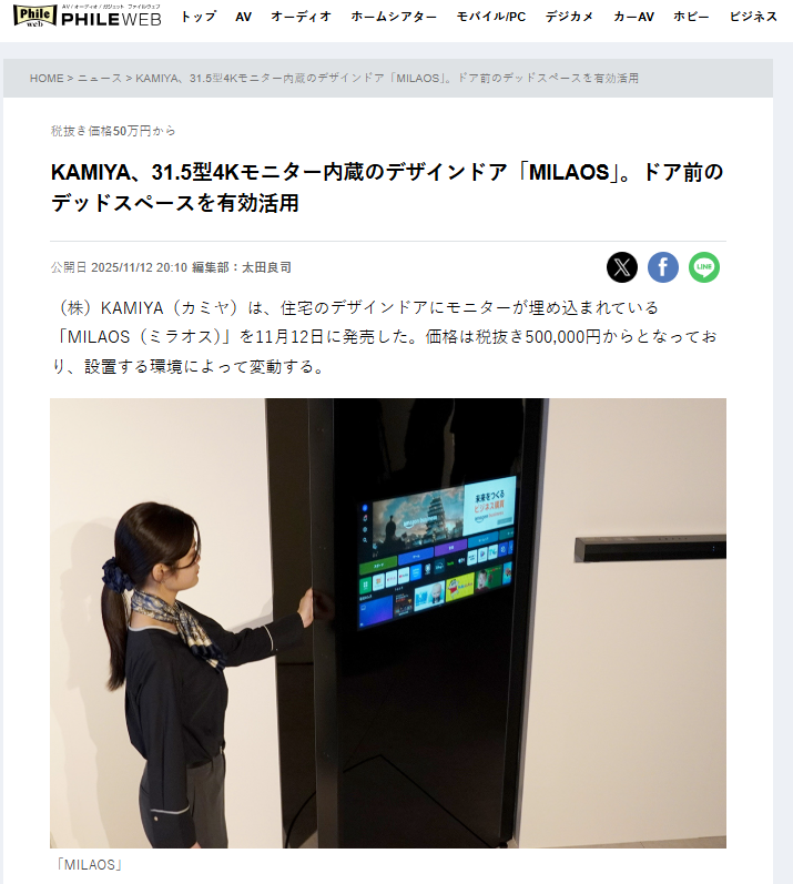 PHILEWEB KAMIYA、31.5型4Kモニター内蔵のデザインドア「MILAOS」。ドア前のデッドスペースを有効活用