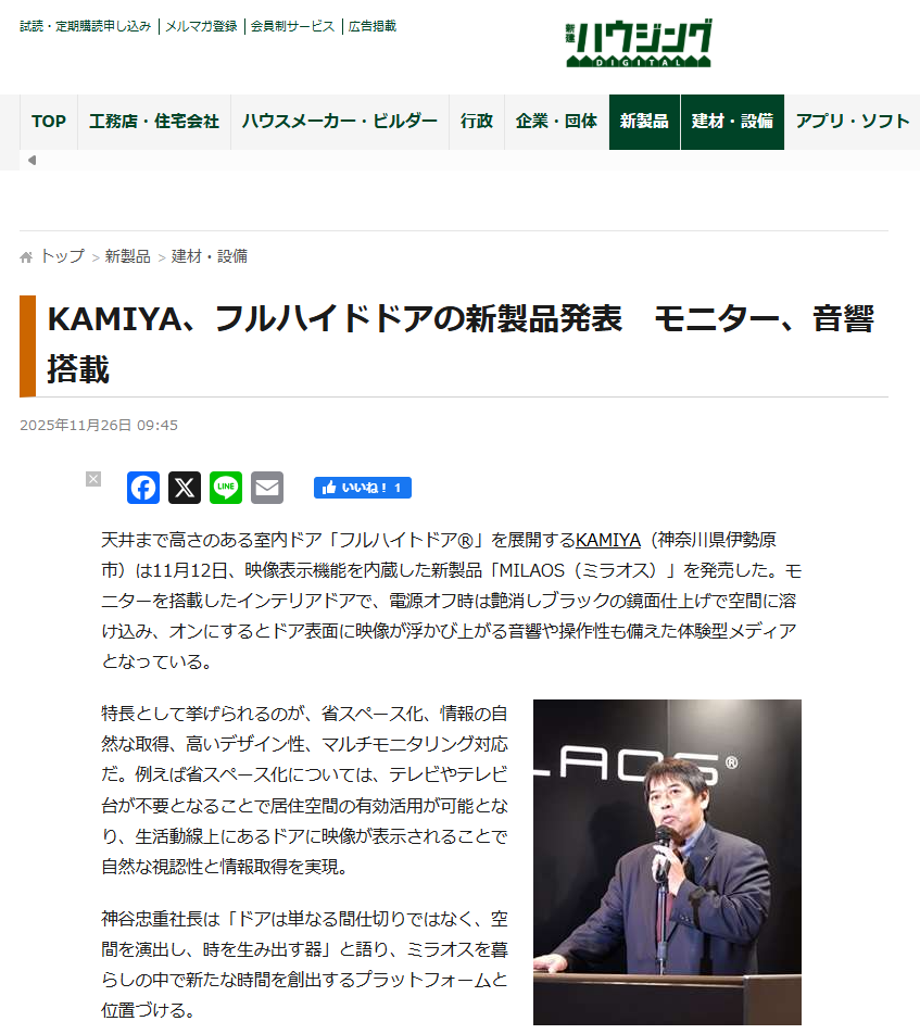 新建ハウジング KAMIYA、フルハイドドアの新製品発表 モニター、音響搭載