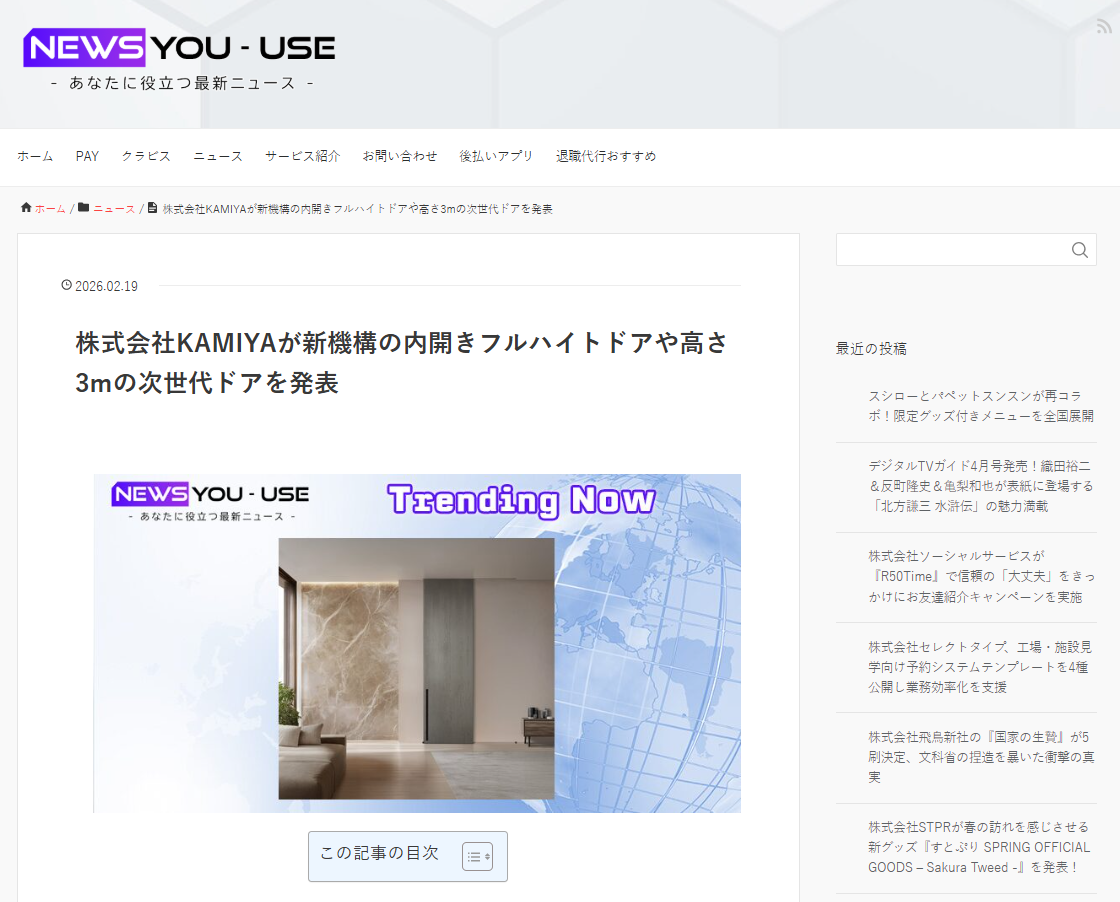 NEWSYOU-USE 株式会社KAMIYAが新機構の内開きフルハイトドアや高さ3mの次世代ドアを発表