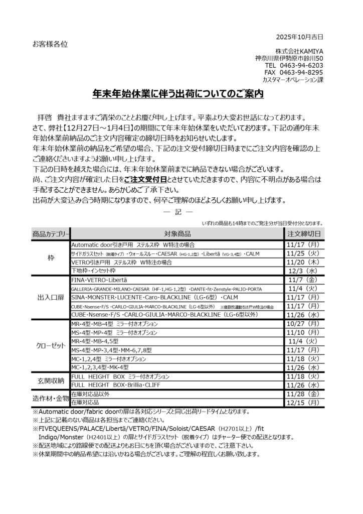 年末年始休業前の納品をご希望の場合、下記の注分受付締切日時までにご注文内容を確認の上ご連絡くださいますようお願い申し上げます。