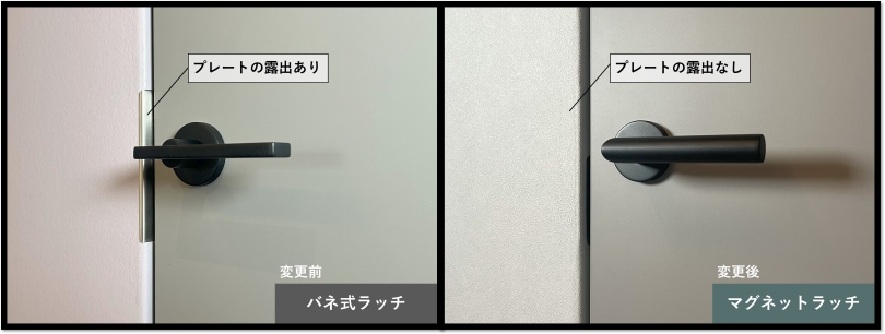 また、バネ式の場合ラッチ受けのプレートは前面に露出していましたが、マグネットラッチの場合はプレートが見えなくなり、より壁面化®を実現できるようになりました。