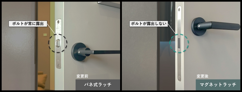 従来の『バネ式ラッチ』は、ラッチボルトが常に露出しているのに対し、新設定された『マグネットラッチ』は、ラッチボルトが見えずフラットな仕様。ドア側面までスッキリとした美しい仕上がりになっています。