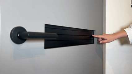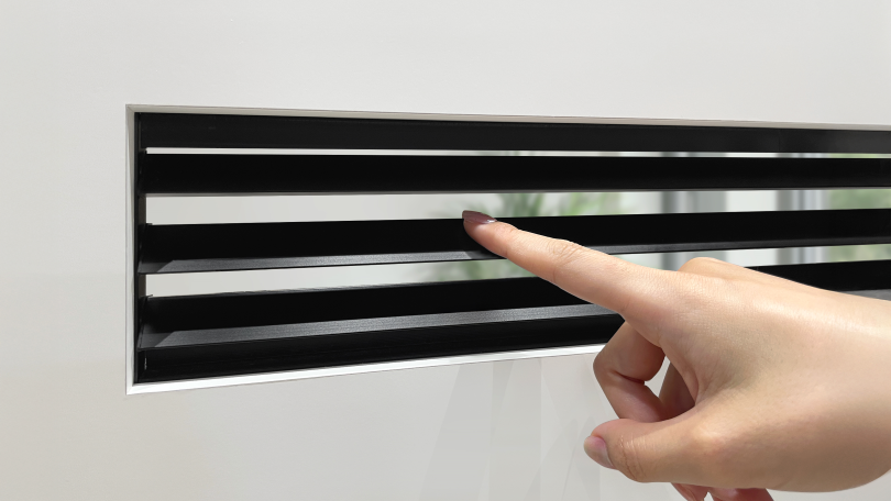 通気をコントロールするルーバーは、スタイリッシュなアルミ製。連動する3枚の羽根は、指先で軽くタッチするだけでスムーズに開閉します。モダンで洗練されたフォルムの通気ドアです。