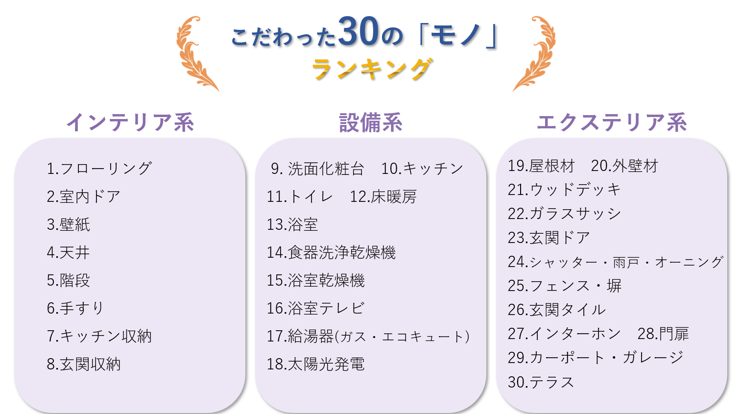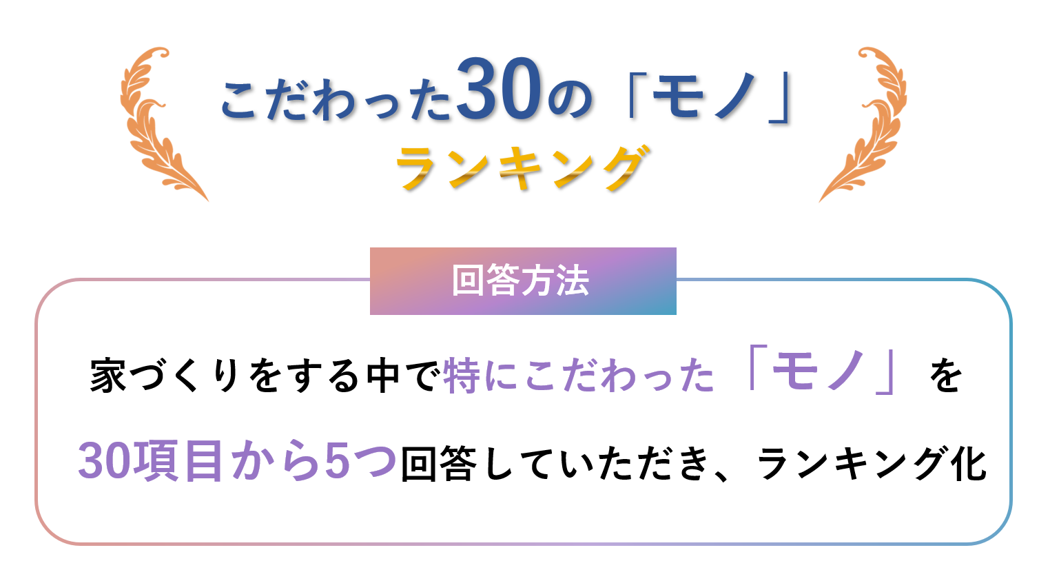次は、「モノ」についてのランキングです。新しくお家を建てるときは、設備や建材からインテリアまで、色々なモノを選べるので本当に楽しいですよね。このアンケートでは、こちらの30の選択肢の中から、特に家づくりでこだわったモノを5つ以内で挙げていただきました。