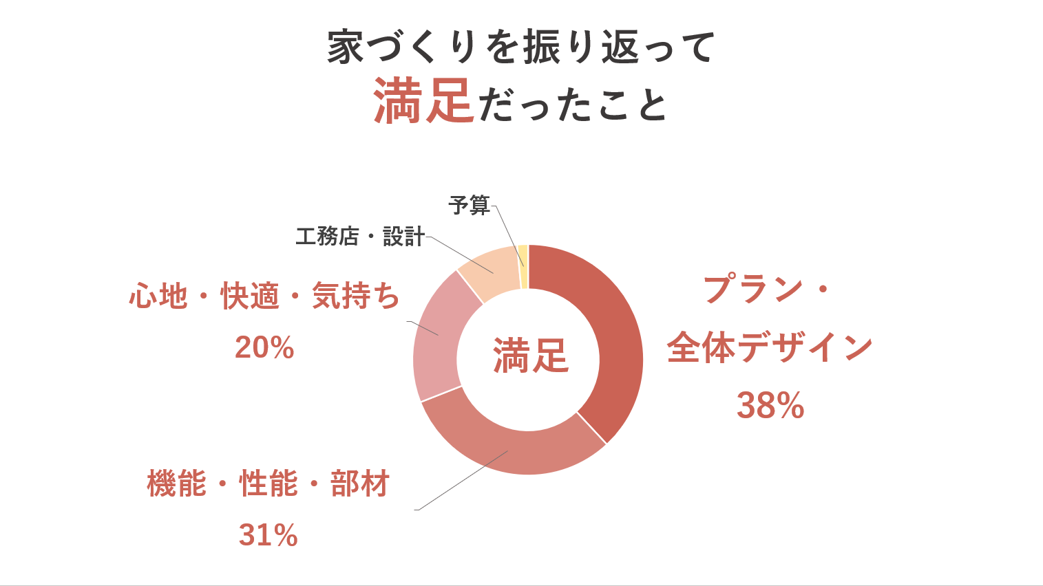 ここまでは家づくりのこだわりについて見てきましたが、次は、家づくりを振り返って、満足だったこと、逆に不満足だったことについて、生の声をご紹介します!こちらは、アンケート結果を大きくカテゴリー分けしたグラフです。
