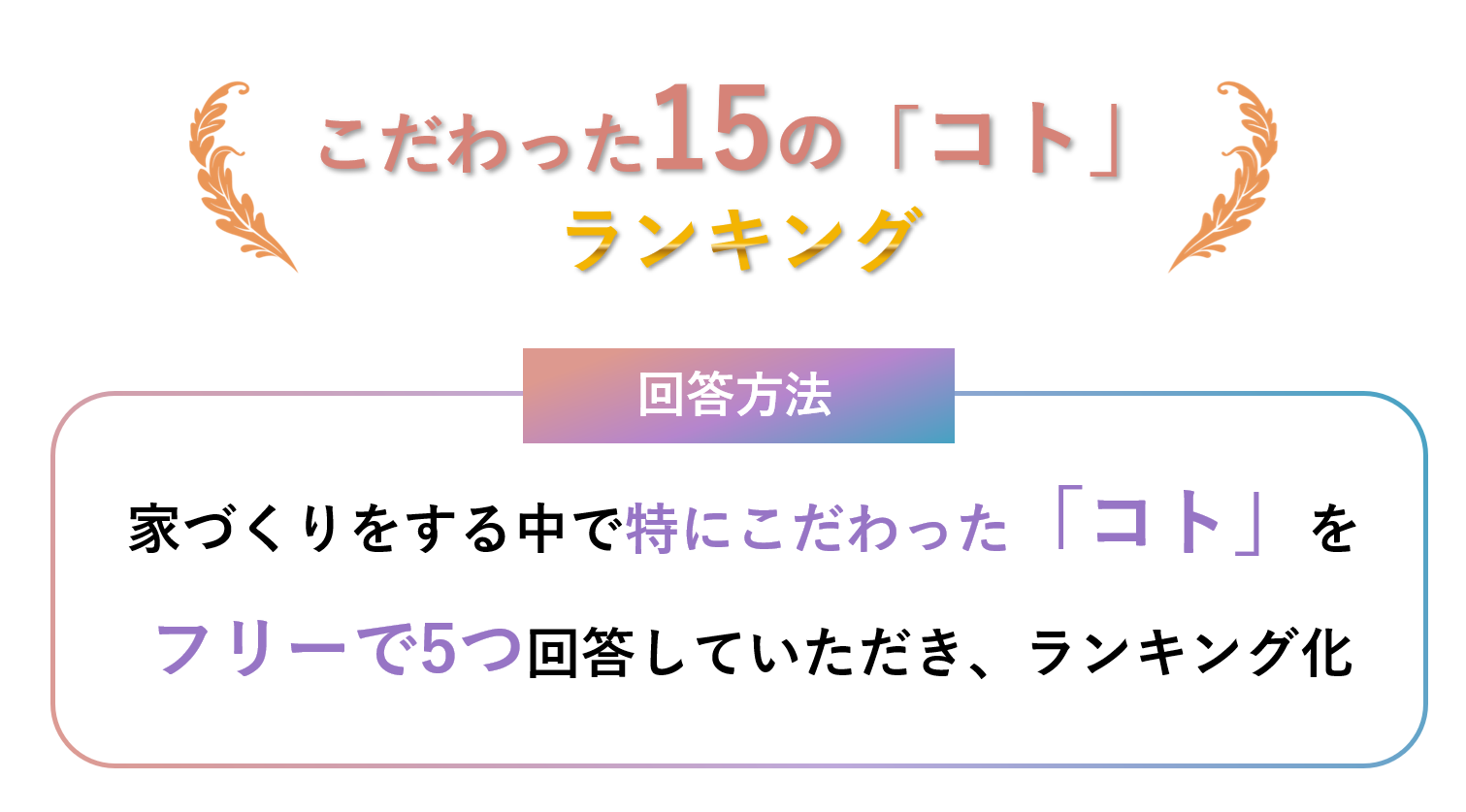 まずは、家づくりをされる中で特にこだわった「コト」をジャンル問わずフリー形式で5つ回答していただき、それをランキングにまとめました。早速、第10位から第6位までの発表です!