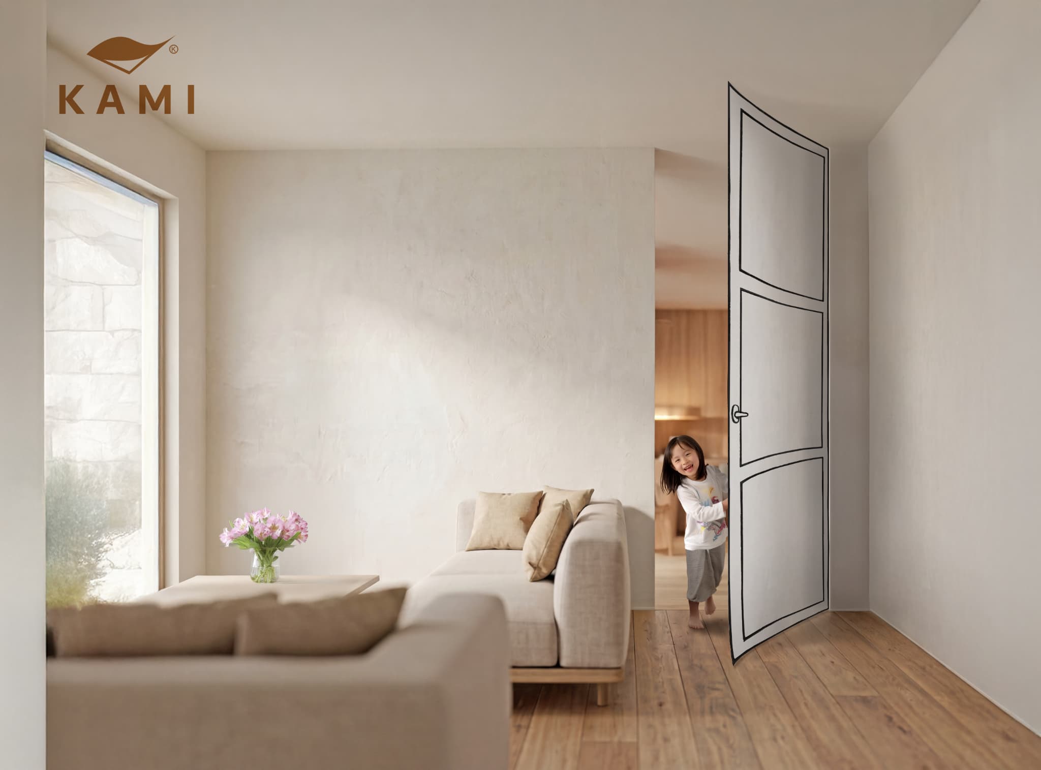 遮音機能をなくし究極のミニマルスタイルを実現したKAMIⓀは、室内外の会話はほぼ丸聞こえ。プライバシーという壁を取り払い、家族のコミュニケーションをアクティベート。