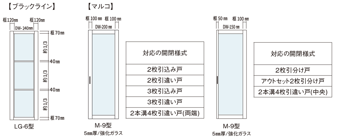 ※下表の片引き戸は「上吊」納まりに限ります。「床付レール」納まりの場合は寸法が異なりますのでご注意ください。